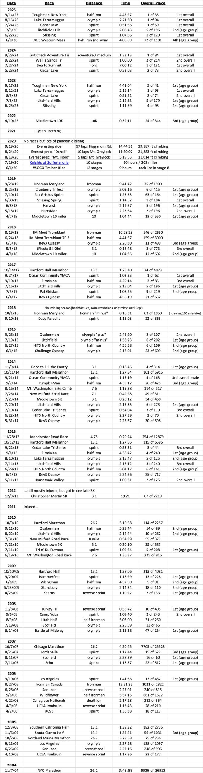 I got bit by the triathlon bug part way through grad school. It started as a way to stay in shape during the off season from skiing but it quickly became one of my favorite summer activities. Here are results from some of my favorite tri and road races: